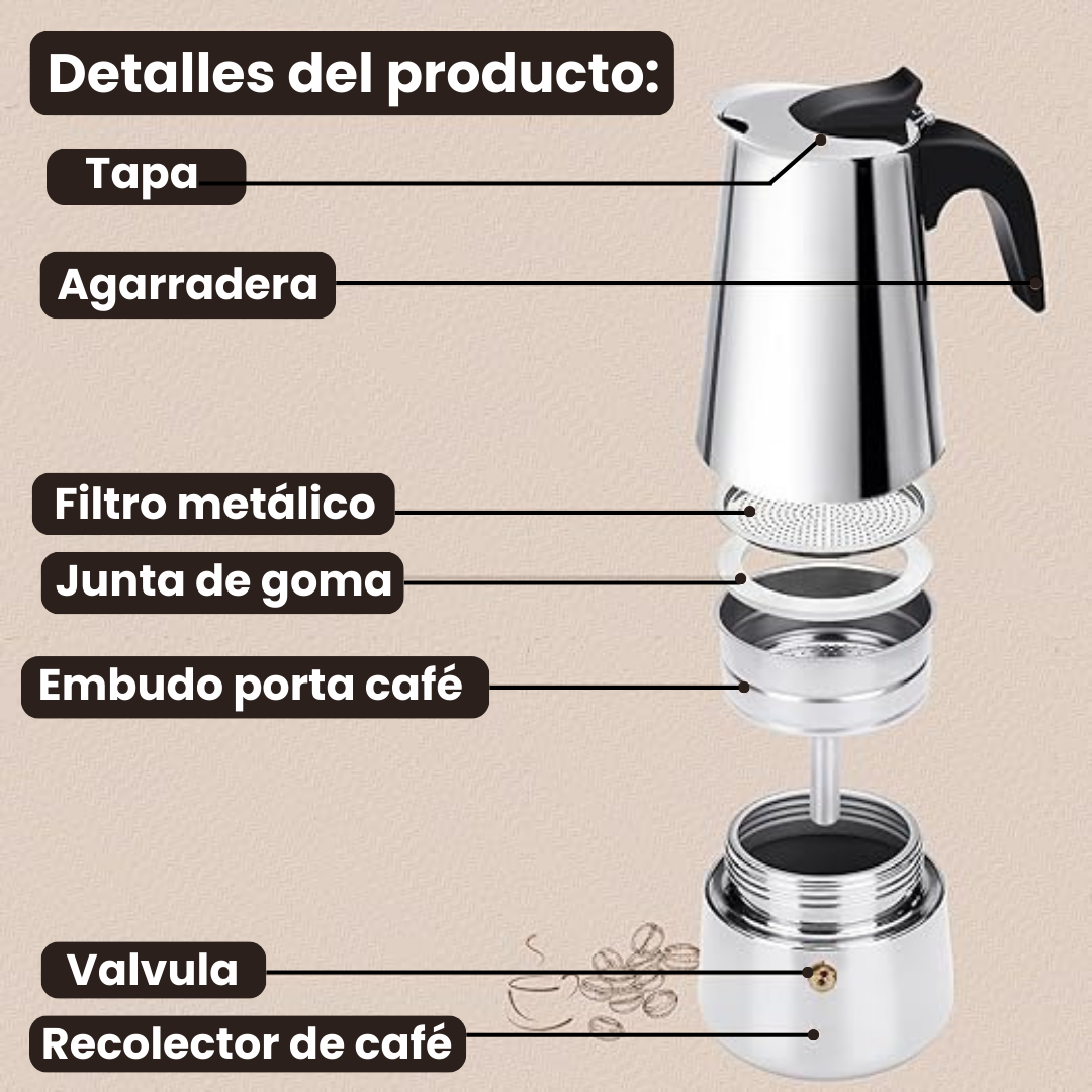 Sumérgete en la gran experiencia de preparar café al estilo Italiano, con nuestra cafetera no solo obtendrás el café mas delicioso que hayas hecho sino que también optimizaras el proceso, ahorraras tiempo gracias a su diseño es fácil de limpiar, no ocupa gran espacio y mantendrá tu café caliente por mucho tiempo
